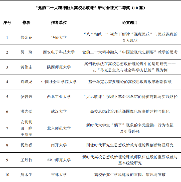 老虎机jackpot-老虎机在线-老虎机网站 关于“党的二十大精神融入高校思政课”研讨会自通知发布以来,得到了全国各高校师生的热烈响应,累计收到300多篇来稿,经主办方组织专家认真评审,现选出获奖论文45篇,其中一等奖5篇,二等奖10篇,三等奖15篇,优秀奖15篇。名单公布如下: