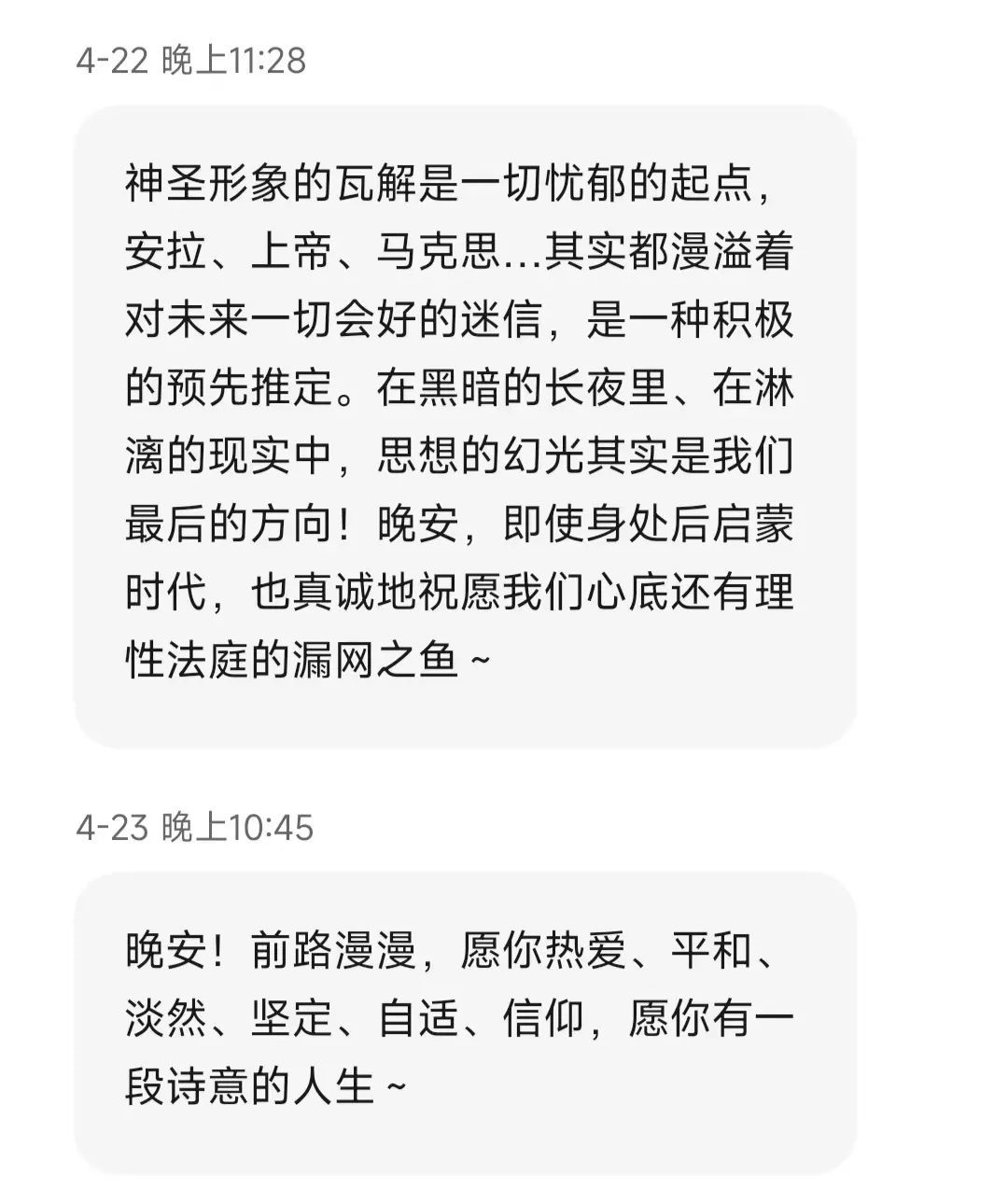 “每天收到晚安短信,有一种拆盲盒的惊喜,看着对方发过来的或是一段鸡汤,或是对方今天发生的趣事,或是简单的晚安二字,都非常的开心和温暖!”