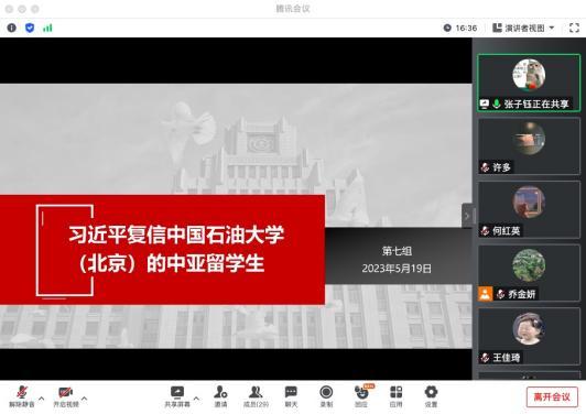 各党团小组就会前学习的心得感悟进行深入交流。第四党团小组的何红英分享了学习习近平总书记在二十届中央政治局第四次集体学习时讲话的心得体会,第七党团小组的张子钰分享了学习习近平总书记复信中国石油大学(北京)的中亚留学生的感悟。正值中国-中亚峰会在西安召开,张子钰表示,我们要关注峰会、支持峰会,以实际行动当好东道主,展现新气象,学习弘扬丝路精神,讲好中国故事、中亚故事。