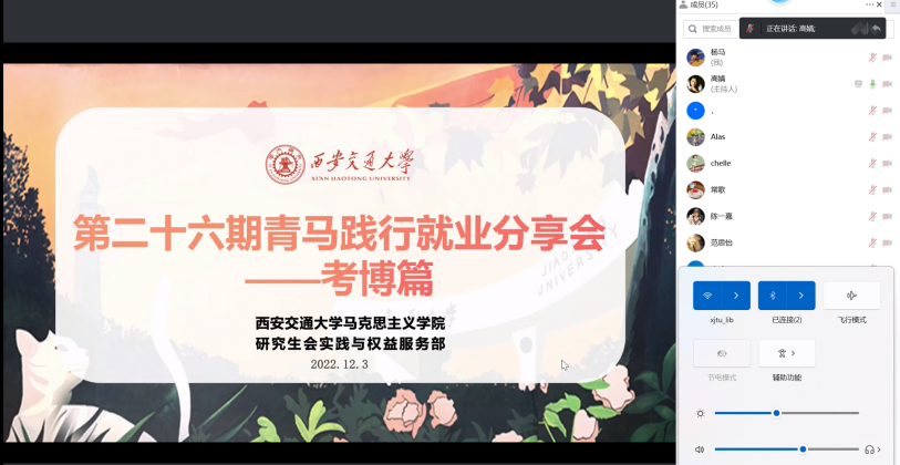 第二十六期青马践行就业分享会暨青年团校朋辈指导分享——考博篇顺利举办。本次分享会邀请到西安交通大学博士研究生张琦和复旦大学博士研究生常歌分享考博经验与感悟。研会实践与权益服务部高婧主持分享会。