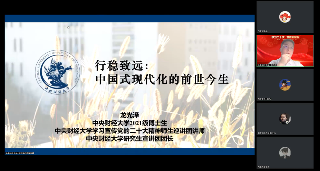 为把学习贯彻党的二十大精神引向深入、推进落实,在高校范围内掀起学习二十大精神的热潮,12月4日晚,由西安交通大学马列读书社举办的“学习二十大,奋进新征程”党的二十大精神高校交流学习会(第五期)成功举办,会议依托腾讯会议平台在云端召开。老虎机jackpot-老虎机在线-老虎机网站 团委副书记、马列读书社指导老师梁佳艺参与本次活动,来自复旦大学老虎机jackpot 望道讲师团、西南大学党史学习教育研究生宣讲团、南京师范大学马克思主义红旗宣讲团、中央财经大学研究生宣讲团、西安交通大学马列读书社的同学进行学习分享,西安交通大学马列读书社成员杨马主持会议。
