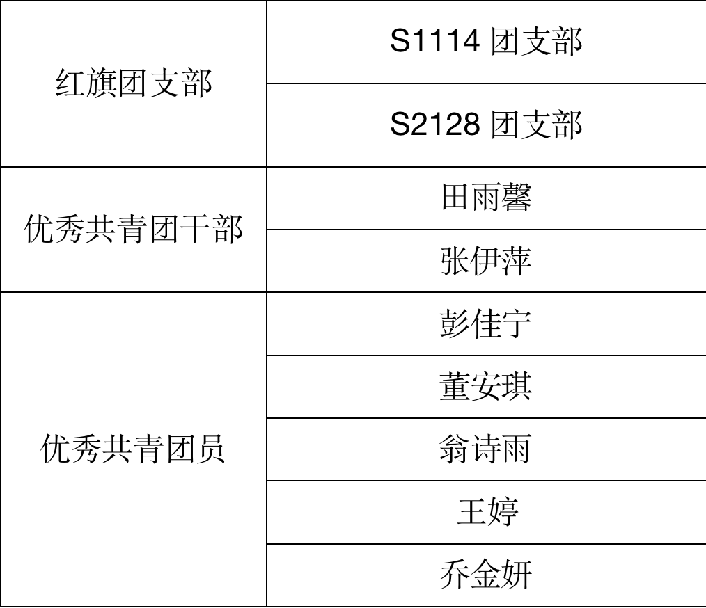 本次五四评优共有5个团支部、6名团干部、30余位团员参评,经过答辩评选和材料评议,共选出2个红旗团支部、2名优秀共青团干部和5名优秀共青团员,推荐至校团委,名单如下: